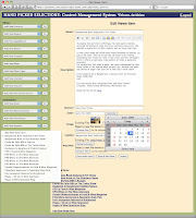 Well that’s pretty much the whole front-end of the site – what the user sees, but it’s what’s behind the site that really shines. Using a very simple, forms-driven interface, the admin can navigate all the major content areas of the site, pull up existing entries to view, edit or delete or add new entries. We have a real editing palette with tools customized for the client, pop-up date selector, thumbnails of attached images, links for attached items as well as related links at the bottom of the page.