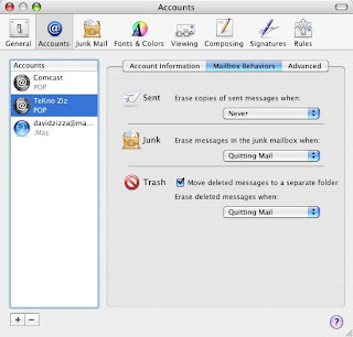 Step 3. Don’t need it? Chuck it! Why are you keeping that invitation to the 2001 insert family name here Cookout? Toss it! The more stuff you hold onto, the slower the program is to respond. All those forwarded emails with 3MB video attachments? Gone. Another great way to slim down on mail storage is to Remove Attachments from old emails you want to hang onto but for which you no longer need the attachments. Select the messages you want and then go the Message –> Remove Attachments command. Also, you can auto empty the Trash and Junk Mail folders when you quit the Mail application by going to Mail –> Preferences, clicking on the Accounts icon and then the Mailbox Behaviors tab. Under the Trash and Junk Mail headings, you can specify a period of time to hold onto mail in those folders, or simply delete them when you quit the program. Caution: make sure to check these folders before you quit the program or shut down the machine, if there is anything you want to keep.